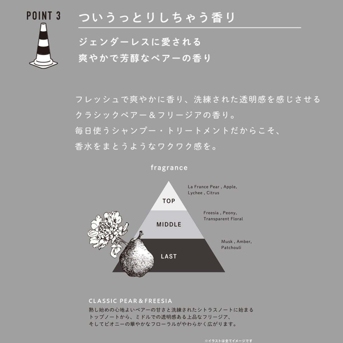 熟し始めの心地よいペアの甘さと洗練されたシトラスノートに始まるトップノートから、ミドルでの透明感ある上品なフリージア、そしてピオニーの華やかなフローラルがやわらかく広がります。